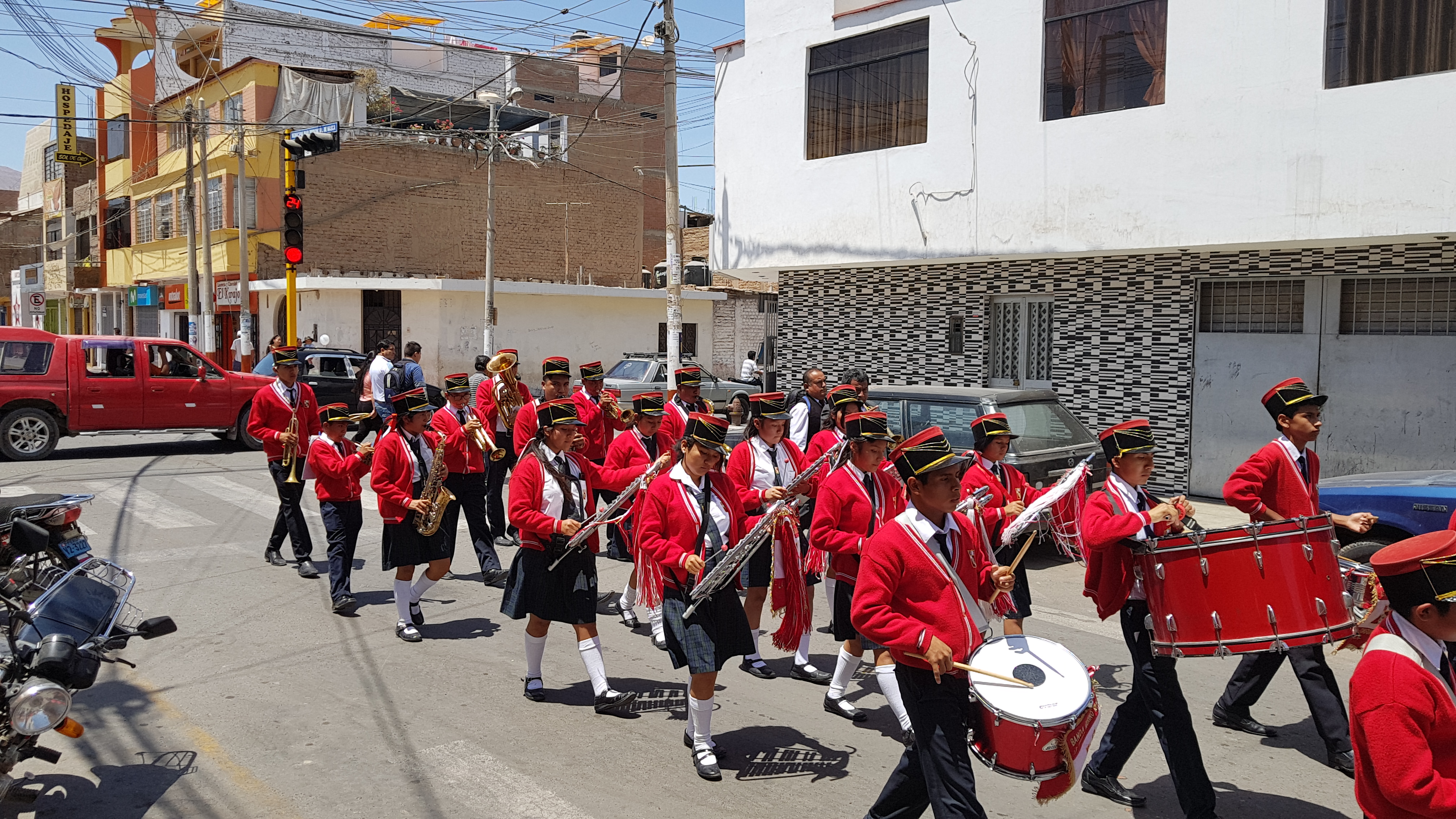 Hoje acordamos, tomamos café e fomos descansar mais um pouquinho quando ouvimos um barulho e ao olhar pela janela vimos um desfile, descemos para ver o que era e ficamos sabendo que todo domingo há esses desfiles na cidade, em homenagem a bandeira.